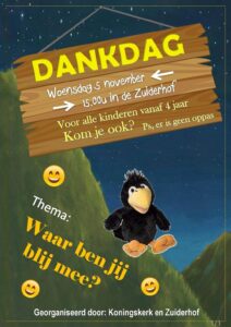 Het is vandaag dankdag. Er is een kinderdienst in de Zuiderhof. Deze begint om 15.00 uur. Ook Tjoepie is van de partij!